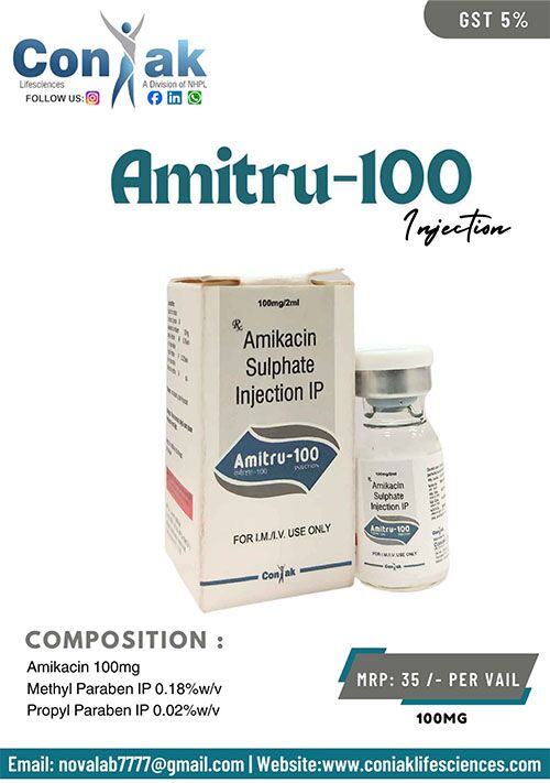 Amikacin 100 mg Injection is a strong medicine that helps fight serious bacterial infections. It is usually given in hospitals by a doctor or nurse through a needle into the muscle or a vein. This medicine is mainly used when other antibiotics do not work or when the infection is very severe.