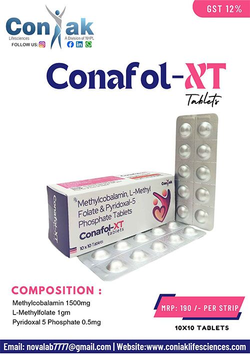 CONAFOL-XT tablets are a powerful combination of three important nutrients: Methylcobalamin (a form of Vitamin B12), L-Methylfolate (an active form of folic acid), and Pyridoxal 5-Phosphate (an active form of Vitamin B6). Together, they help your brain, nerves, and body work better. This medicine is often used when your body doesn’t get enough of these vitamins through food or when you have trouble absorbing them properly.