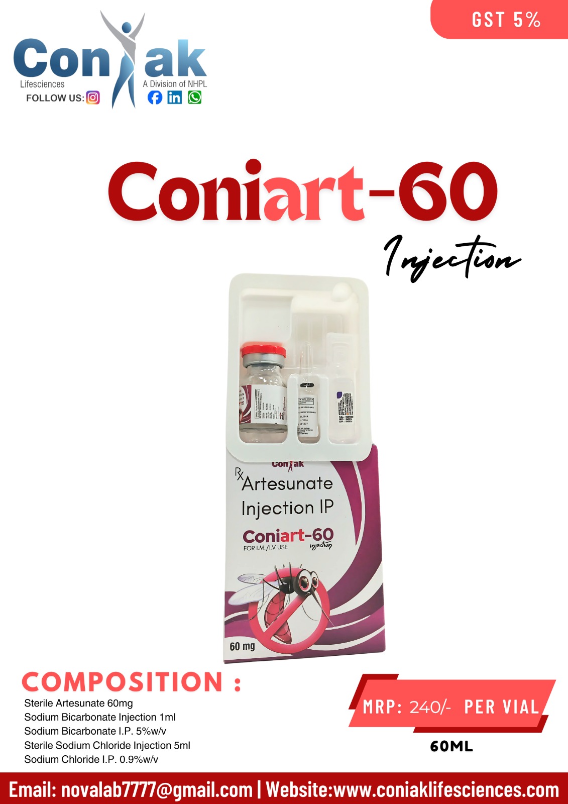 - Comprehensive Kit: By providing the Artesunate along with the necessary Sodium Bicarbonate and Sodium Chloride solvents in one package, Coniart-60 ensures that healthcare providers have everything they need for a precise and sterile preparation.
