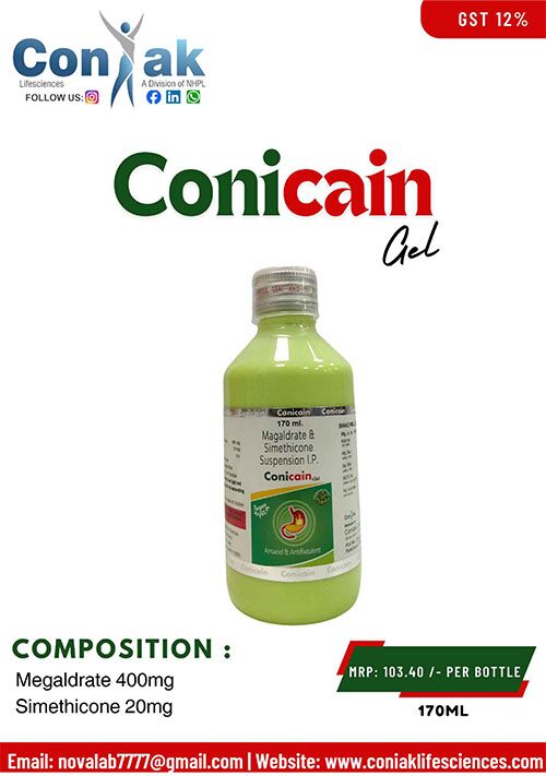 Do you often feel a burning sensation in your chest after a heavy meal? Or do you feel uncomfortable because of constant bloating and gas?. CONICAIN GEL, a powerful combination of Magaldrate and Simethicone, is specially made to give you quick and long-lasting relief from all types of stomach acidity and gastric problems.