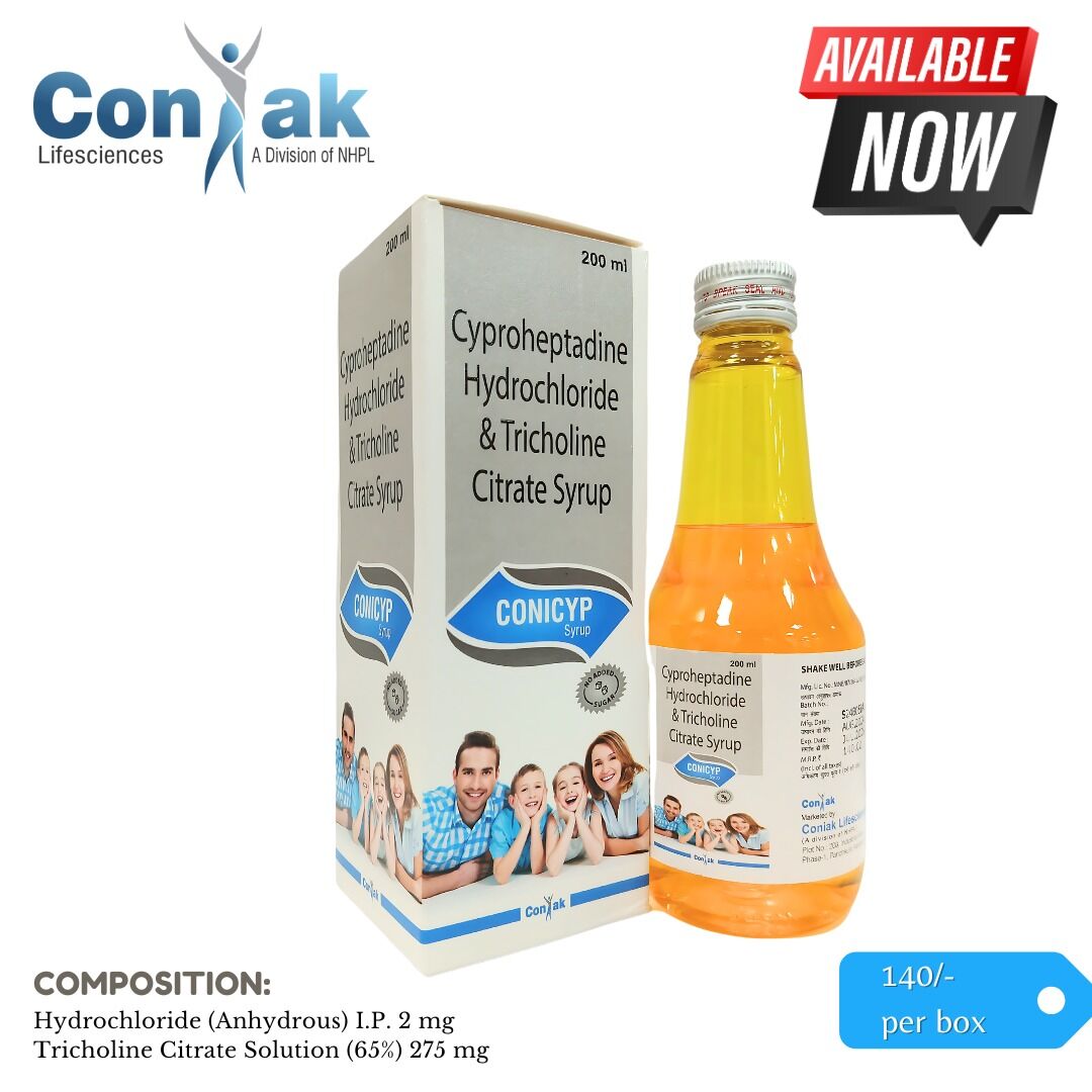 Cyproheptadine Hydrochloride and Tricholine Citrate Syrup is part of a class of medications known as ‘appetite stimulants,’ used to enhance appetite and address issues related to the digestive system and metabolism. This combination aids in treating reduced appetite, weight loss, and anorexia nervosa, which is an eating disorder associated with low body weight. Additionally, it is often prescribed for underweight children who do not consume enough food, along with conditions like loss of appetite, anaemia, liver or digestive disorders, and as a supplementary treatment during anti-tubercular (anti-TB) and antiretroviral (anti-HIV) therapies for weight gain.