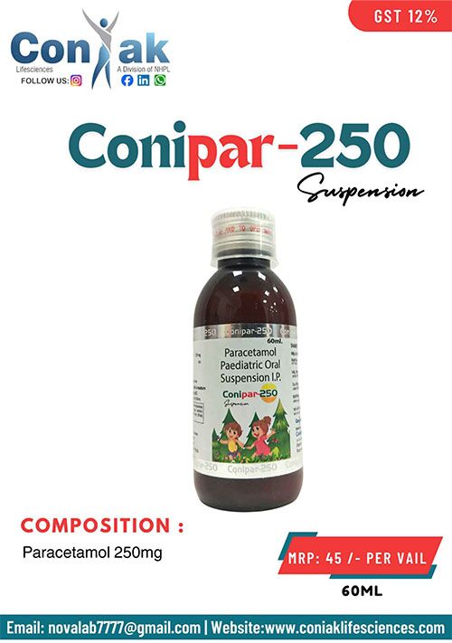 CONIPAR consists of 250 mg of Paracetamol. It is an oral liquid suspension that is frequently recommended for alleviating pain and reducing high body temperatures. This medication is primarily utilised by children for treating headaches, fevers, and common colds. It is also used to relieve toothaches and body aches. Paracetamol Syrup serves as a pain relief solution that is commonly employed to reduce discomfort. It functions by inhibiting chemical messengers in the brain that signal pain in the body.