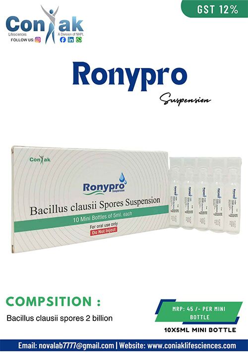 A healthy gut is the foundation of a strong body, a sharp mind, and a comfortable life. RONYPRO, a premium formulation of Bacillus clausii Spores Suspension, is designed to restore and maintain the natural balance of good bacteria in your digestive system. Developed by Coniak Lifesciences, this easy-to-use oral suspension helps individuals recover gut health and feel their best from the inside out.