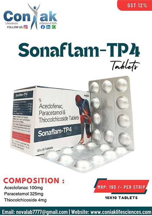 | Composition | Aceclofanac 100mg, Paracetamol 325mg, and Thiocolchicoside 4mg Tablets |